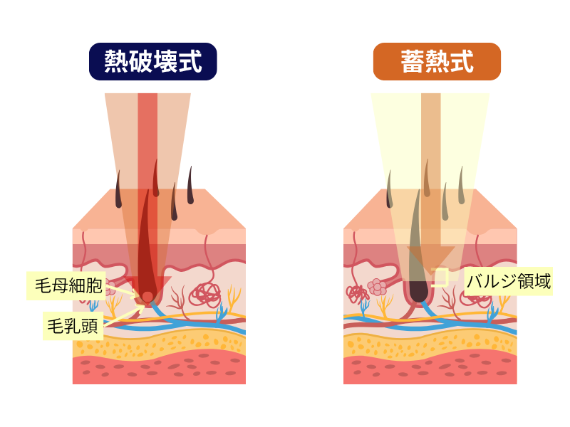 蓄熱式は毛を作る毛乳頭に向けて指令を出し発毛を促す働きを持つ「バルジ領域」に蓄熱させ、ダメージを与えています。一方、熱破壊式は「毛母細胞」と毛母細胞に栄養を受け渡す「毛乳頭」をターゲットにしています。
