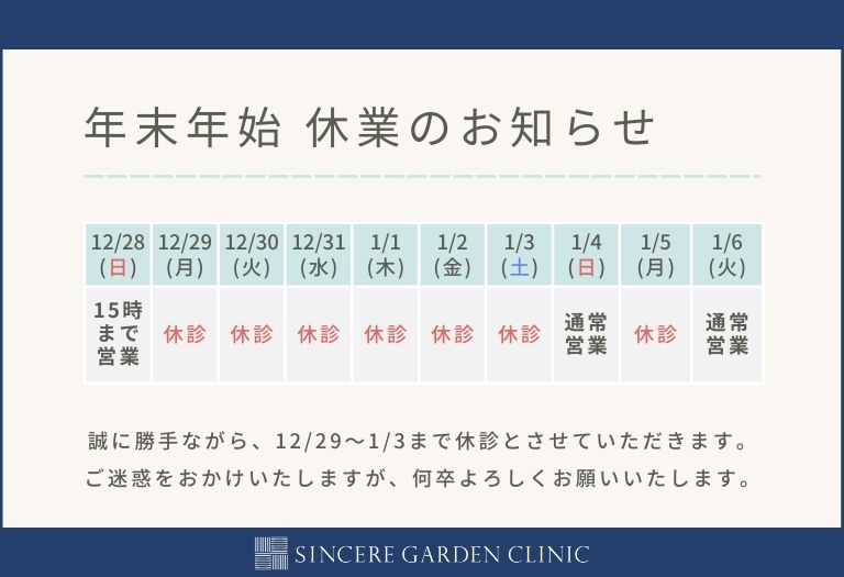 誠に勝手ながら、 2025年12月29日~2026年1月3日の 年末年始の期間は、下記のとおり 診療時間の変更をさせていただきます。