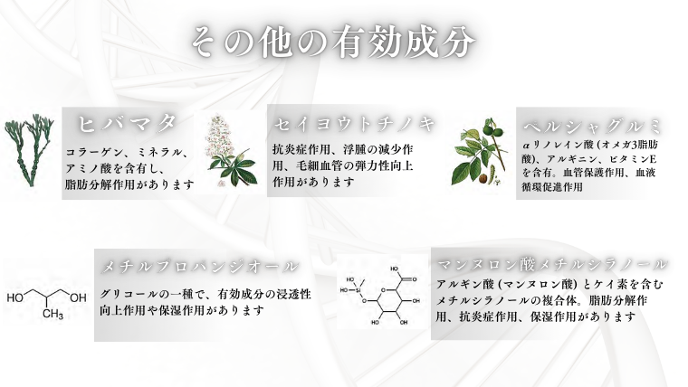 BNLSファットバーンには、デオキシコール酸ナトリウムの効果を補完し、治療後の肌の引き締め、むくみ対策、炎症鎮静に寄与する以下のような植物由来成分と機能性成分が複合的に配合されています。