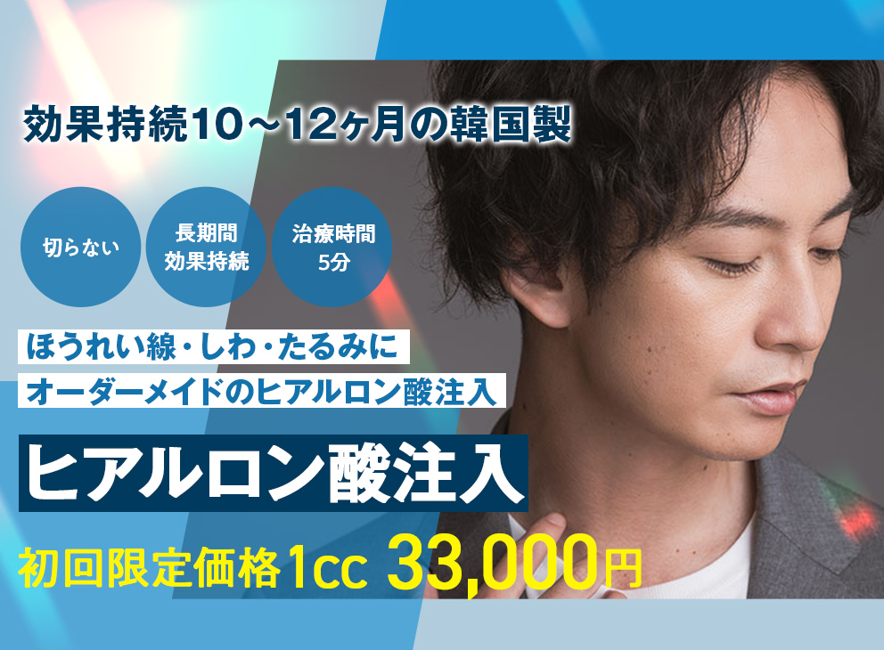 ヒアルロン皮膚充填剤(医療用のヒアルロン酸)を皮膚に注入して内側からシワや溝を目立たなくさせたり、ボリュームを補ったりするものです。特にほうれい線や目元のシワを改善する為の治療として広く知られております。また、シワの改善だけでなく、粘度の高いヒアルロン酸を使用することで鼻を高くしたりアゴの形を整えたりすることが出来ます。